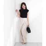 サイズ感が大きめなので、普段のサイズよりワンサイズ下げてもいいかもしれません。着丈も長めなのでヒールのある靴や厚底スニーカーが合うと思います。