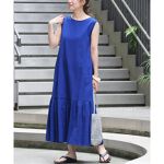 綺麗なブルーです。リネン・綿素材でさらりとしていて肌ざわりが良いです。インナーキャミソールが付いていて透け感もほとんど気になりません。裾のギャザーがシンプルなワンピースにさりげないアクセントになっていて大人かわいいワンピースです。