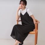 小さなドットでストンとしたシルエットが大人可愛い。後ろのスリットは見えにくいように配慮されていて、ポケットありで、透けもない。サテンだけど、テカテカしてないのも良い。