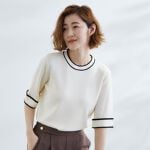 店頭で色違いを購入。気に入ったので、ネット通販で購入しました。クーポンなど使ってお安く買えました。五分丈で今の季節にピッタリ!首周りが開くデザインが好きではなく、こちらのニットは首周りは開かないので安心です。