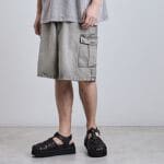 ダボついてます。ガーチョパンツとワイドパンツを合わせてデニム生地ガジュ短パン?なったかんじ。