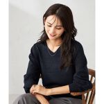 vネックがちょうどいい空き具合で、深すぎず、1枚でもいいしブラウスをインして襟を出してもいいし、着こなしやすいです。想像していたよりラメ感が強く、ちょっとくすんだブルーでした。