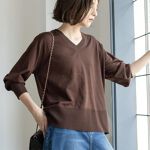 Lを購入しましたが、とてもゆったりサイズです。Vネックは思った以上に深くて、モデルさんのように一枚で着るのは難しいので、見えてもいいインナーを合わせようと思います。生地はサラサラで軽くて楽だと思いました。モコモコしたニットが苦手なので、生地の厚みは調度いいです。