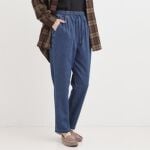 腰回りがゆったりしていて着脱はとても楽ですが、幅がやや広いように思います。SSでも良かったかな。ジーンズですが、柔らかい生地なのでは着心地は良いです。家での作業用にはぴったり。