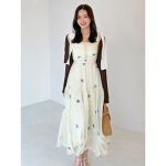 ネイビーの1を注文しました。キャミソールワンピースですが、背中にゴムが入っているので胸元があいてしまう心配がなく、良いと思いました。丈は154センチで足首くらいでした。リボンは自分で結ぶタイプで調整ができます。