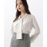 ボウタイが長めで、袖の長さにゆとりがあります。ラッフルが可愛く、ネックレスも自然につけられそうな感じです
