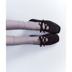 色は茶色がかったグレージュで、少しカーキのように見えると思います。履いた瞬間、インソールが足裏を包み込みような感覚。立ちっぱなしの時に着用してみましたが、手持ちのパンプスより疲れにくく感じました。マイナス1の理由はこちらのブランドは0.5刻みのサイズがなく、サイズ感が大きくなるためです。ソールは大丈夫ですがサイド(側面の黒い部分)が滑るので着地の際に斜めから入ると危ないかも。併せて、水滴が付くと目立つので雨の日はお留守番確定。紐はゴム製で元々接着されているのかと思うくらいリボンは解けず、着脱が楽です。