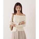 ネイビーを購入しました。オフショルの襟の形を整えるのに少し手間がかかりますが、控えめなフェザーがポイントになり、素敵なニットです。リブですが、思ったよりもぴたっとしすぎず着やすいです。