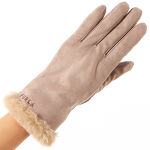 スエード調の素材、手の甲は普通でサイズはピッタリ、手袋の入り口に短めのファーが付いてオシャレです。スエード調なので、カジュアルでもキチンしたコートでも合わせやすいです。