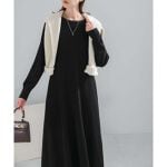胸の下あたりの切り替えとそのあたりから下に少しずつ広がって行く型になっているため、ダボッとした感じではなく、思ったよりも体のラインがきれいに見えます。丈は私の身長ではくるぶしから約5cmくらいでした。袖は5cmくらいキュッとしていてV字にカットしてあり、手首に抜け感が出るようになっているようですが、V字でなくても良かったと思いました。