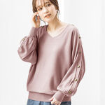 生地は少し薄めですが、下にロンTを合わせたり、上にカーディガンを羽織って来ています。腕のボタンの部分とくすみピンクが可愛いです。