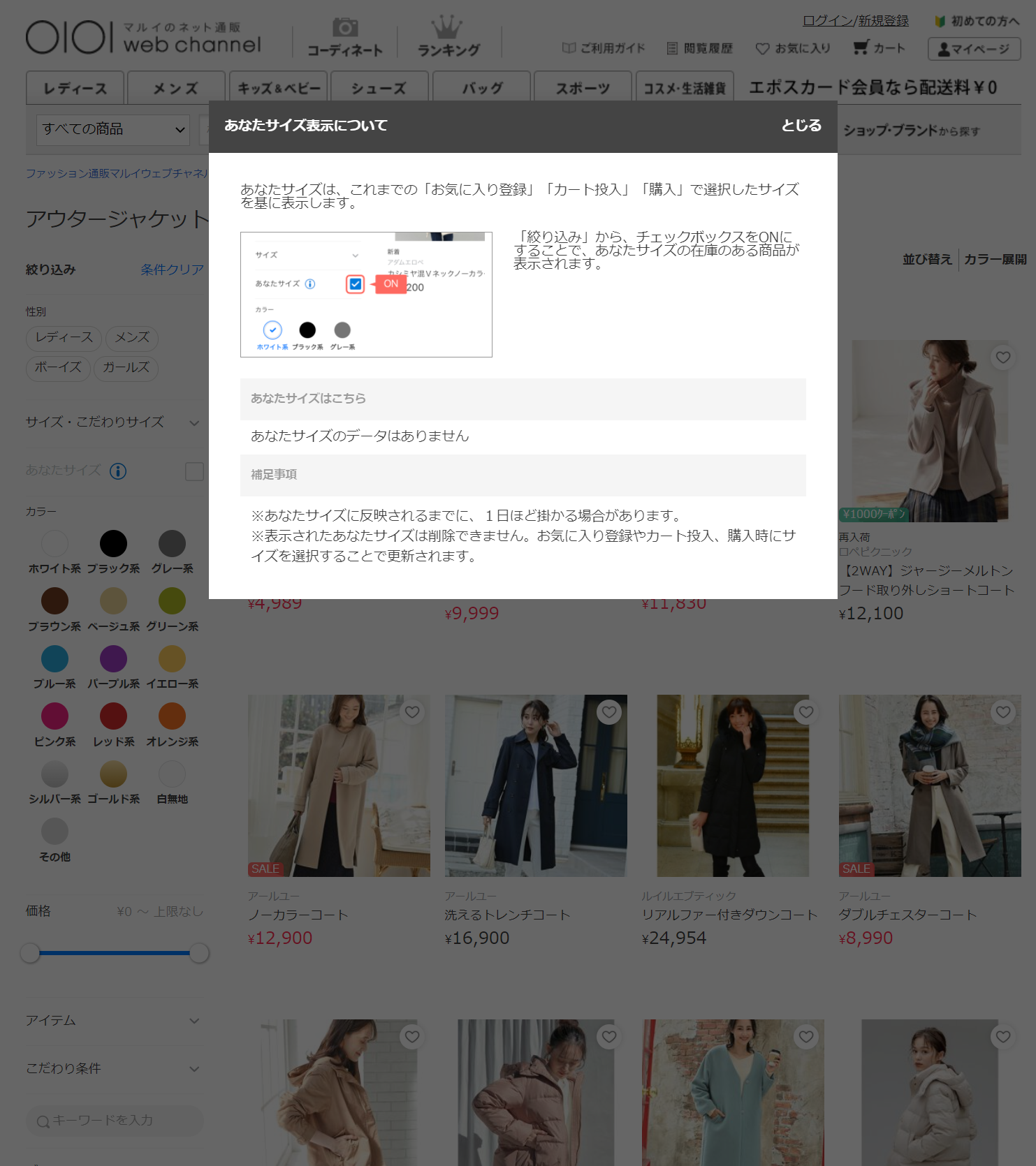 あなたサイズをONにすれば、お探しのサイズで在庫のある商品をすぐに検索できます。
