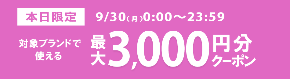 ※9/30(月)0:00~23:59の期間中ログインで、お一人様1回限りご利用いただけるブランドクーポン<クーポン名称:9月30日の対象ブランド限定クーポン(10,000円以上商品対象)・9月30日の対象ブランド限定クーポン(6,000円以上商品対象)・9月30日の対象ブランド限定クーポン(3,000円以上商品対象)>をプレゼントいたします。
