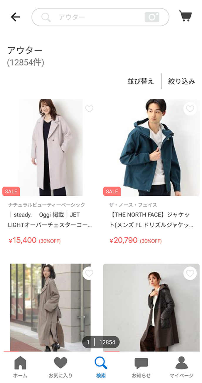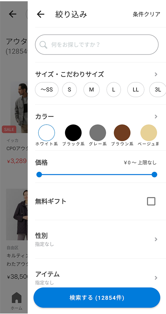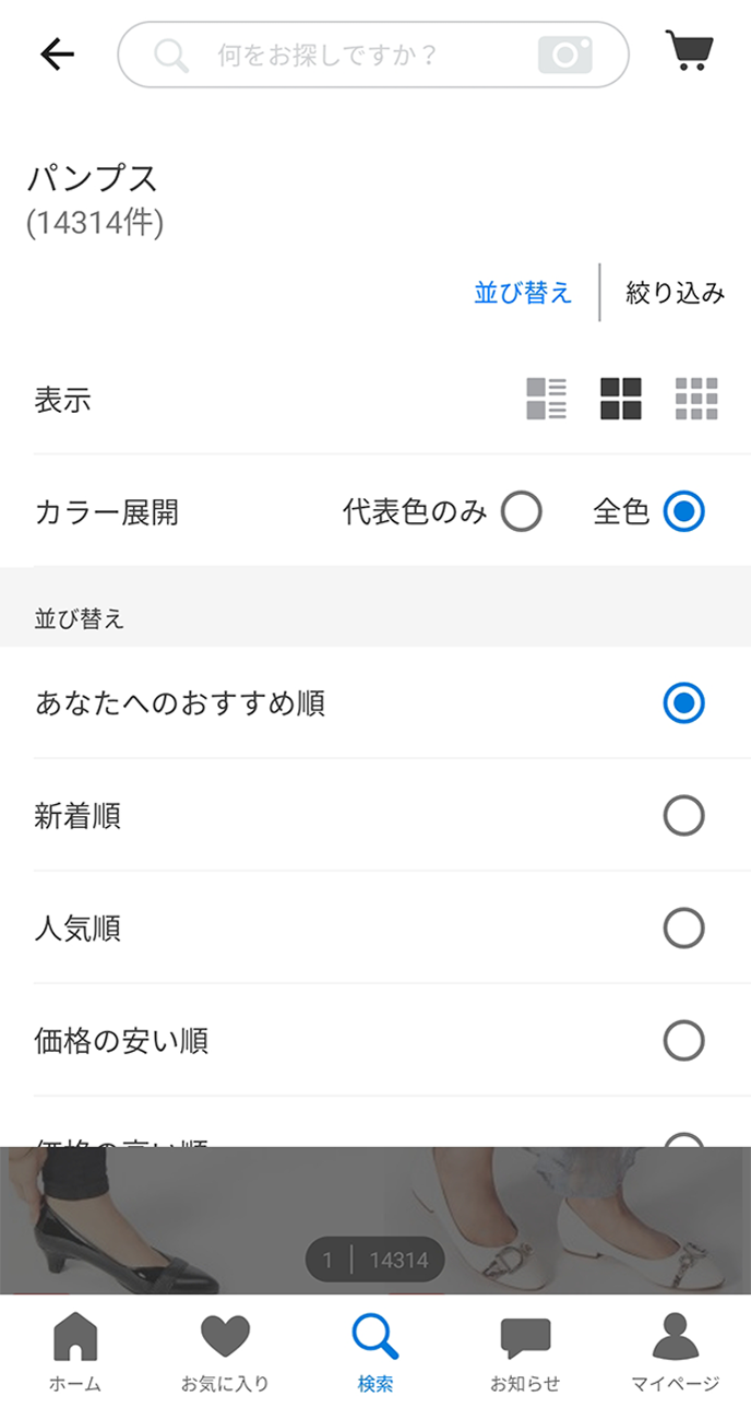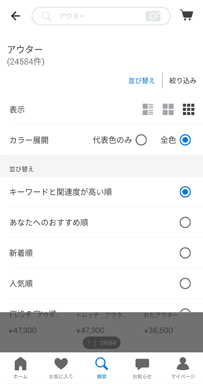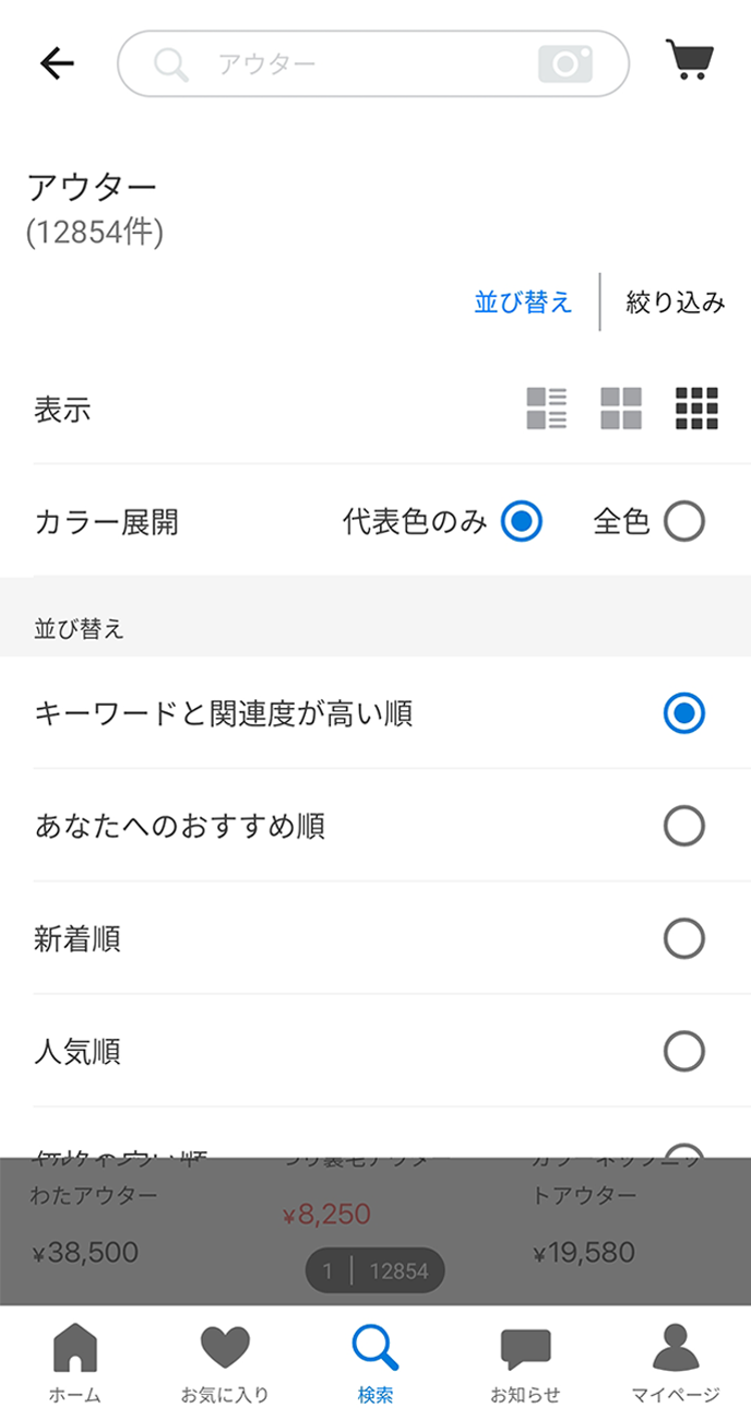 絞り込み検索・並び替えの表示をタップして、あなた好みの検索結果にしていくことができます。