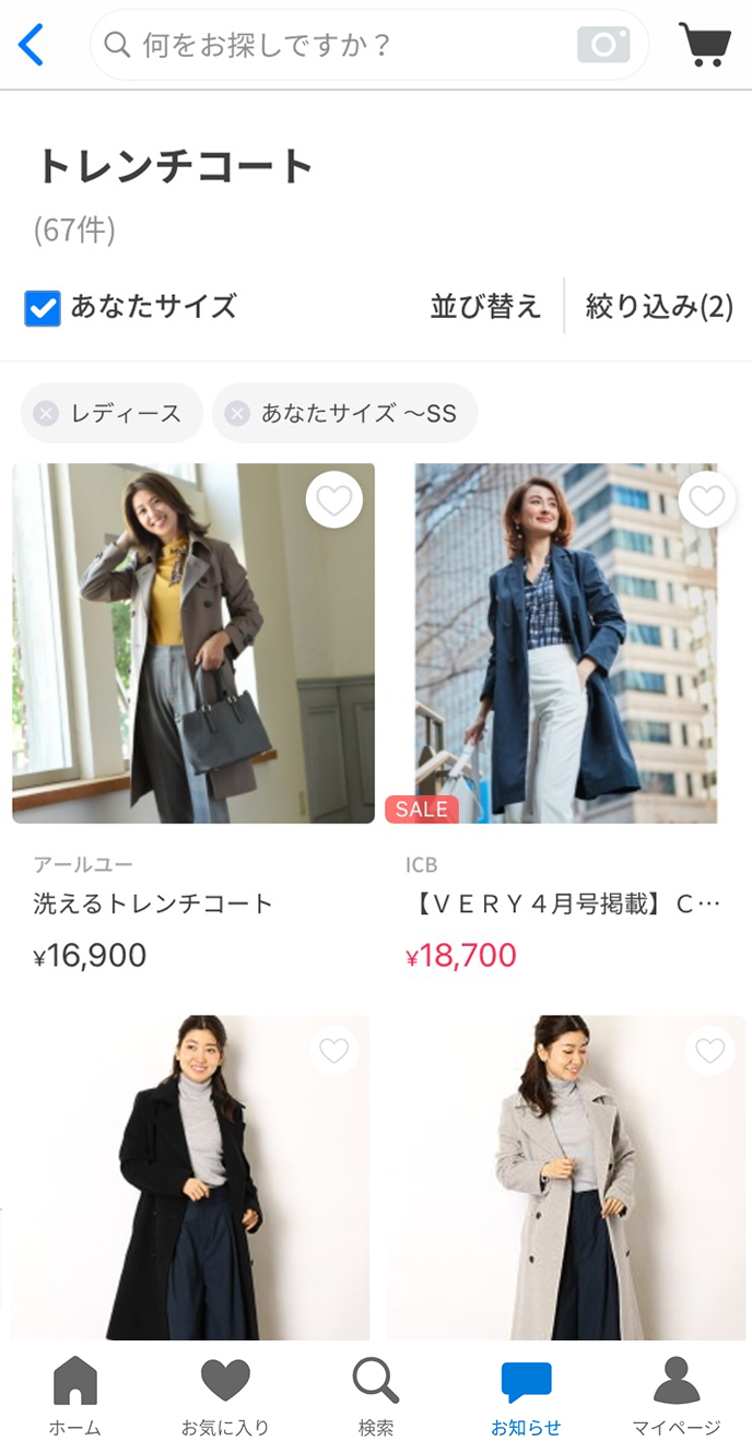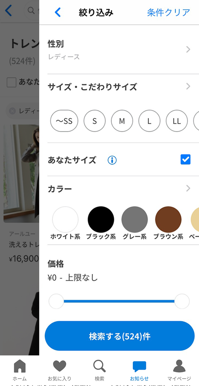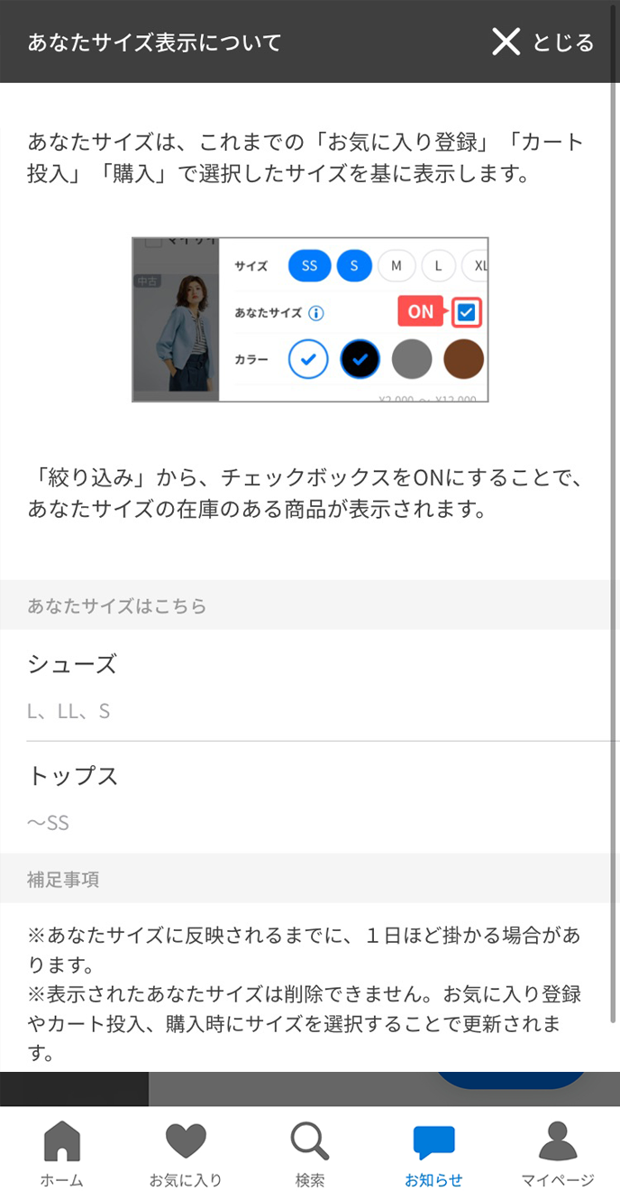 あなたサイズをONにすれば、お探しのサイズで在庫のある商品をすぐに検索できます。