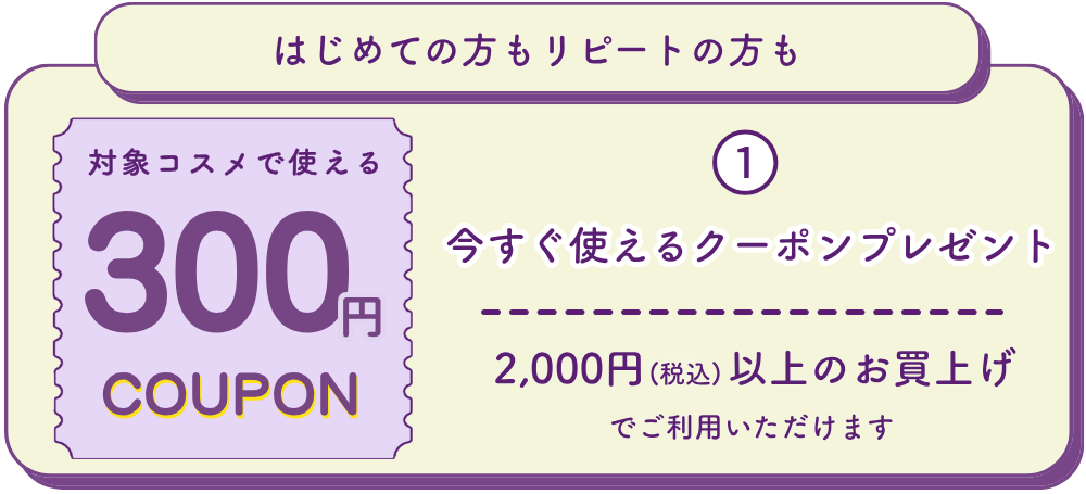 ※❷のクーポンは❶のクーポンではじめてコスメをご利用いただいた方に9月中旬頃プレゼントいたします。