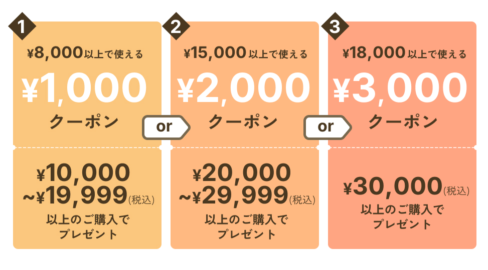 期間中、お買い上げ金額の合計に応じて、下記のクーポンをプレゼントいたします。