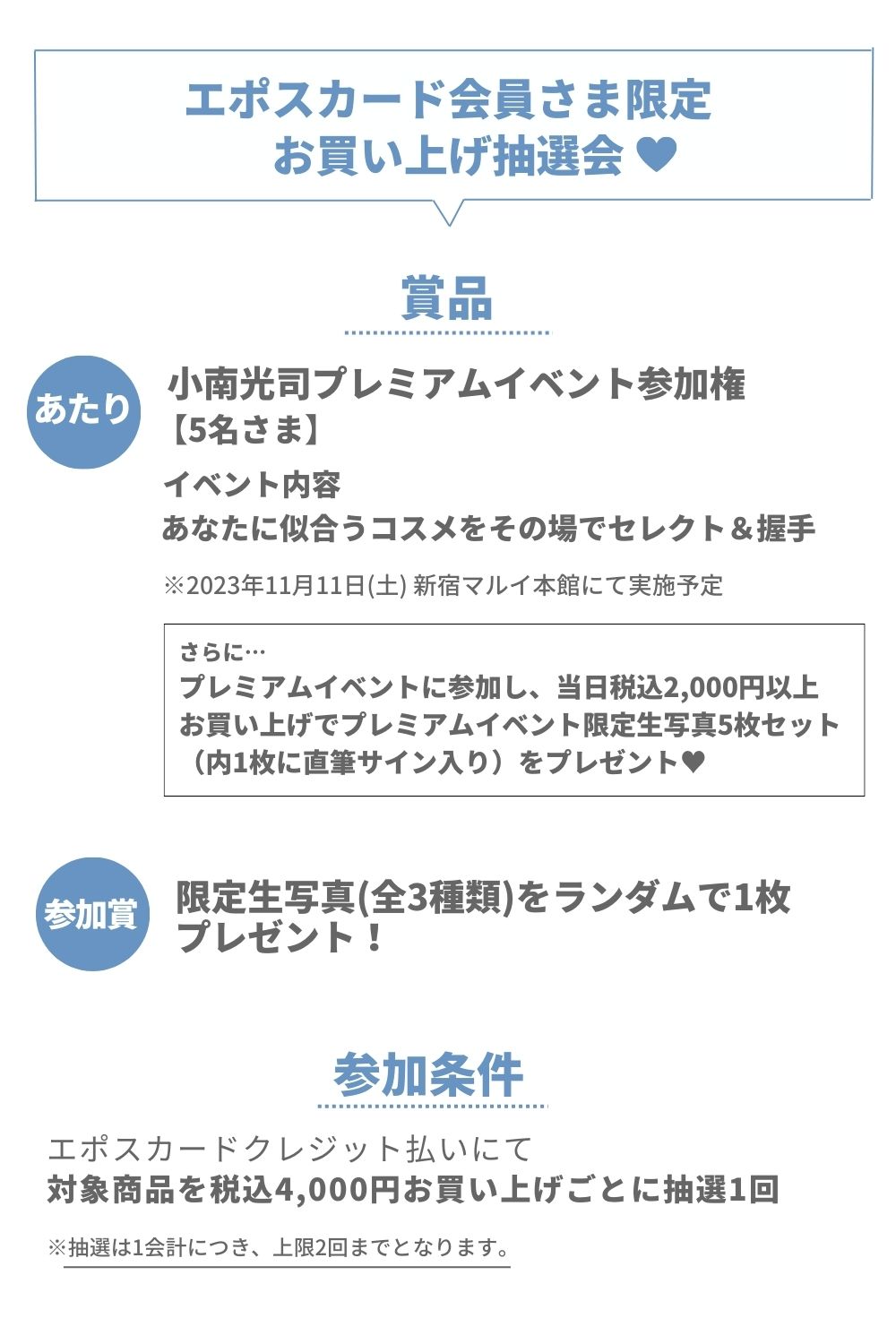 抽選会では、小南光司が直接コスメを選んでくれるプレミアムイベントへの参加権が当たります♥