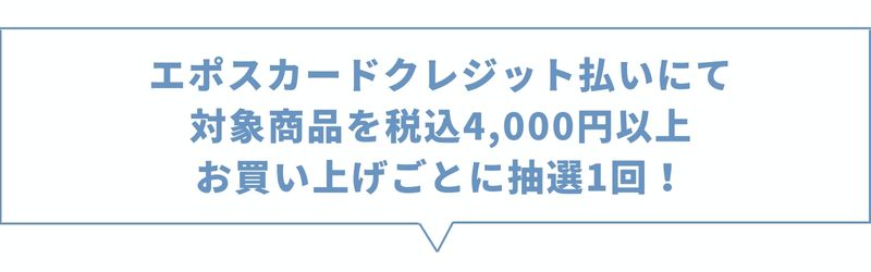 エポスカードクレジット払いにて、対象商品を税込4,000円お買い上げごとに抽選会に1回ご参加いただけます。