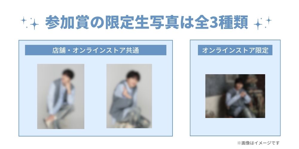 参加賞の限定生写真は1会計につき、税込4,000円ごと・上限2枚までとなります。