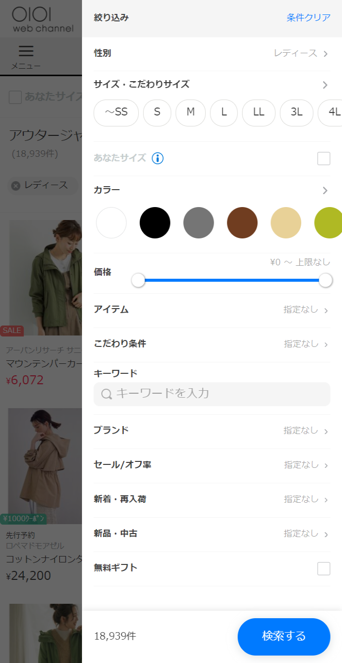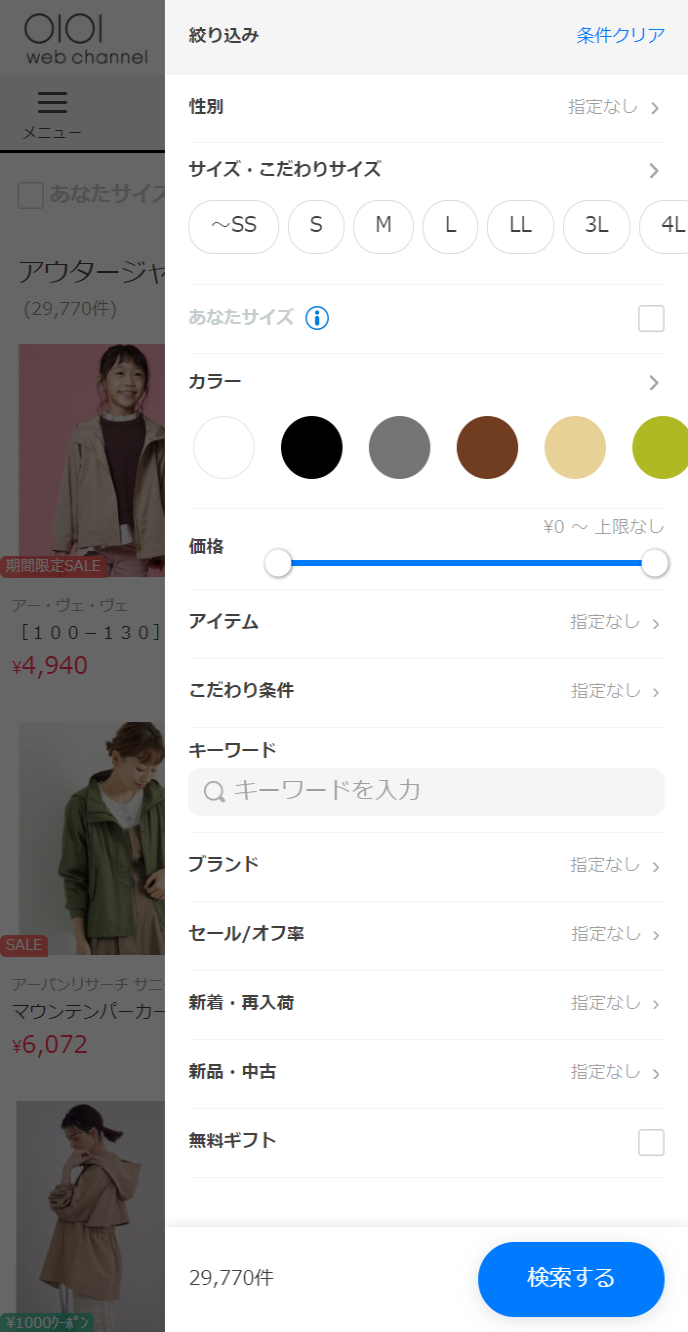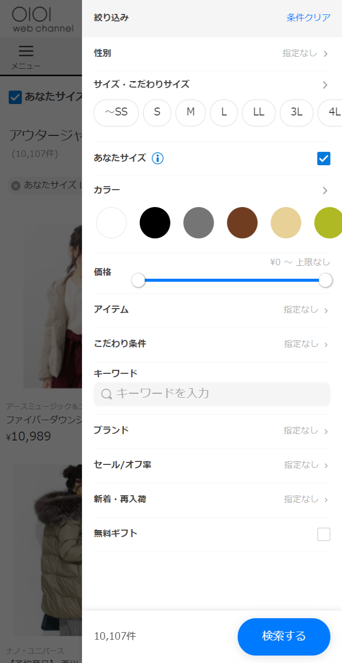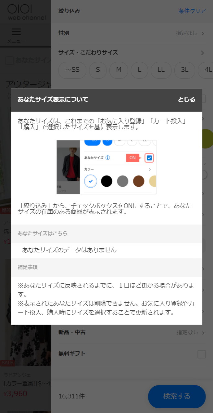 あなたサイズをONにすれば、お探しのサイズで在庫のある商品をすぐに検索できます。