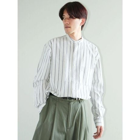 首のラインや顔周りをすっきりと見せてくれるバンドカラーがポイント。生地が絶妙な落ち感とルーズさを醸し出してくれます。