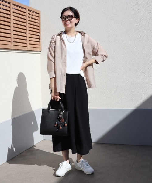 シンプルなカットソータンクトップに透け感のあるシアーシャツを重ねて、涼しげなレイヤードスタイルに。スカーチョを合わせることでキレイめカジュアルに仕上がります。シアーシャツは、インナー次第で印象を変えることができるため、1枚持っていると普段のコーディネートでも活躍します。
