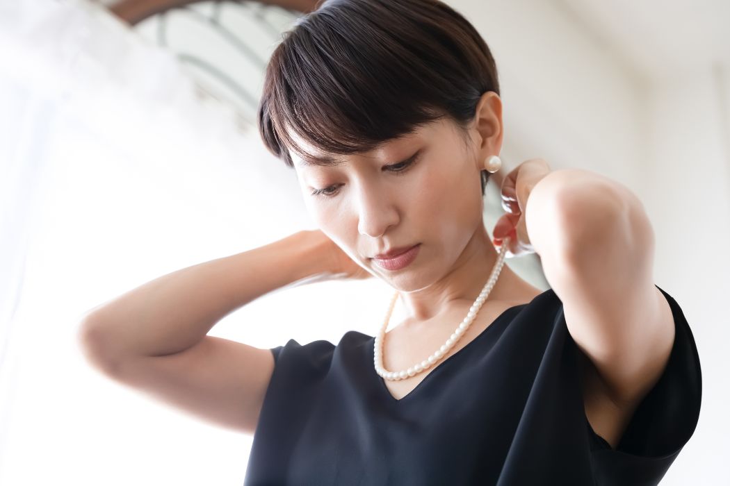正装をする際には、シンプルなパールのネックレスで華やかさを演出してみましょう。パールネックレスはどんなデザインのドレスにも合わせやすいという特徴があるので、ひとつ手元に持っておくとさまざまなシーンで重宝します。特に、日中行われるイベントに出席する場合は派手な印象になりすぎないためにも、パールやクリスタルのアクセサリーを選ぶことがポイントです。一方、夜はきらびやかな輝きが印象的なダイヤやルビーなど、大粒で華のあるネックレスなども好まれます。このように、服装だけでなくアクセサリー類も、行事やイベントの時間帯に応じたものを選ぶことが大切です。