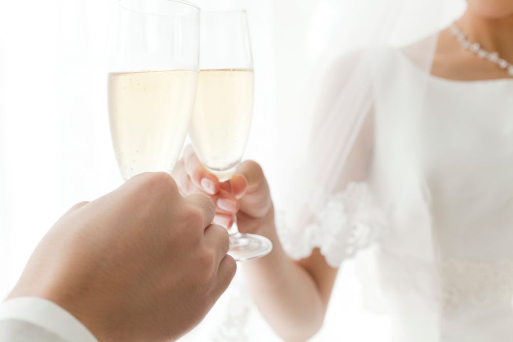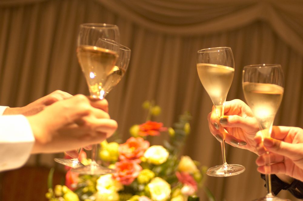 乾杯の挨拶ではとにかく簡潔に終わらせることを意識したうえで、3分程度のスピーチを考えておくことがポイントです。たとえば、「〇〇(新郎)さん、〇〇(新婦)さん、ご結婚おめでとうございます。ただ今司会の方からご紹介にあずかりました、〇〇○○(会社名)の〇〇でございます。僭越ではございますが、乾杯の音頭を取らせていただきます」などとして、司会者に合図を送ってゲストに起立してもらいます。乾杯のタイミングに関しては、司会者に伝わりやすいように指示を出すことがポイントです。もし、自分自身でゲストに起立を促すのであれば、「それでは皆様グラスをお持ちの上、お立ち上がりください」などとするとスマートです。
