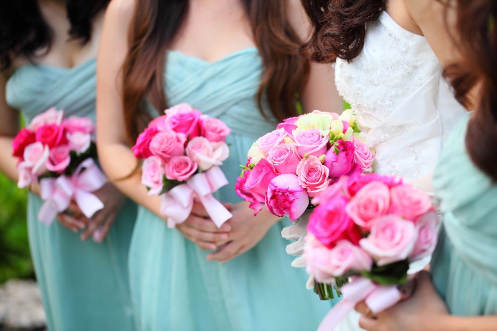 ブライズメイドに選ばれるのは、新婦の友人や姉妹などです。まったく同じドレスを全員が合わせて着ることもあれば、カラーのみ合わせて、それぞれデザインを変えることもあります。