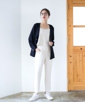 白のアシメワイドパンツにネイビーのダブルジャケットを合わせて、爽やか垢抜けコーデ!