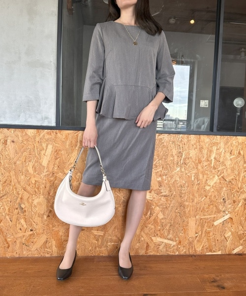 〈ペプラムトップス・タイトスカート 2点セット〉 きっちりとした印象になるセットアップ! お腹周りをカバーしてくれるので着痩せできるのが嬉しい! 卒業式や入学式にもぴったりだけど、お呼ばれやセレモニーシーンにも合いそう!