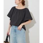 ネックにゴムを通してギャザーをつくったデザインカットソー。