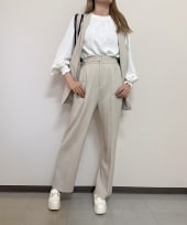 オフィスカジュアルにぴったりなパンツセットアップ! 着心地抜群なので長時間の着用も楽ちん♪ ジャケットはシルエットがキレイでスッキリと! パンツもゆったりしつつもきちんと感は忘れないデザインです◎ テーパードデザインなので、すらっと見えも叶います。