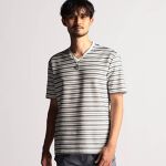 VネックTシャツでのコーデ。白×ネイビーのマルチボーダーが爽やかな印象のVネック。通気性の良いカノコ素材の凸凹した生地で肌に張り付かない快適な着心地。適度な厚さなのでポロシャツ代わりに1枚での着用もオススメです。