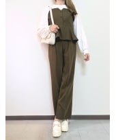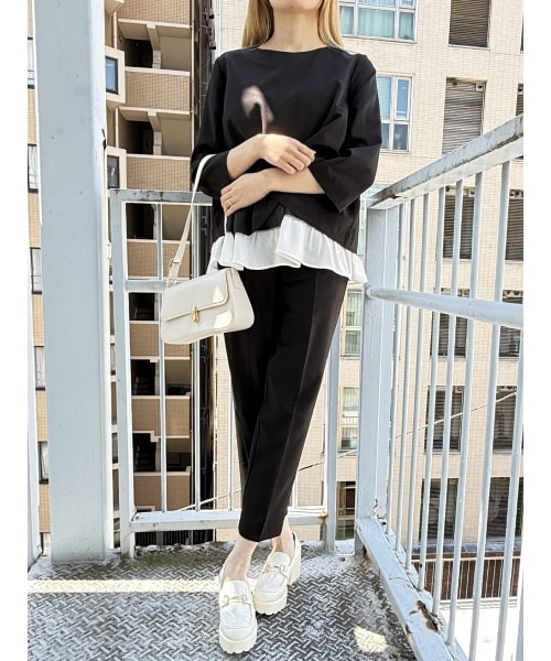 Aラインのレイヤード風トップスとテーパードパンツのセットアップは、可愛く体型カバーをしてくれる嬉しいアイテム。 トップスはゆったりシルエットでお腹まわりも安心。 パンツは脚長効果抜群で、オフィスカジュアルから休日スタイルまで幅広く活躍します。