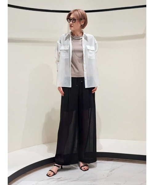 すりガラスのようなマットな透け感が素敵なシャツです。程よくハリがあり、袖をくしゅっと上げた時の立体感が◎。また、肌から浮くので涼しく着て頂けます。前後差のある丈感やサイドスリットデザインは、さっと羽織るだけでもサマになるポイント。