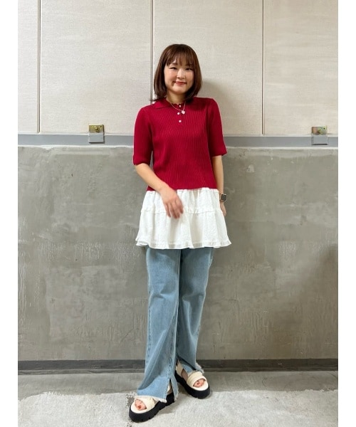 リブニットのポロはリブニットでも生地感が柔らかくピタッと身体のシルエットを拾いすぎないのでとっても着やすいです^^ 赤が差し色になってコーディネートの主役になります。