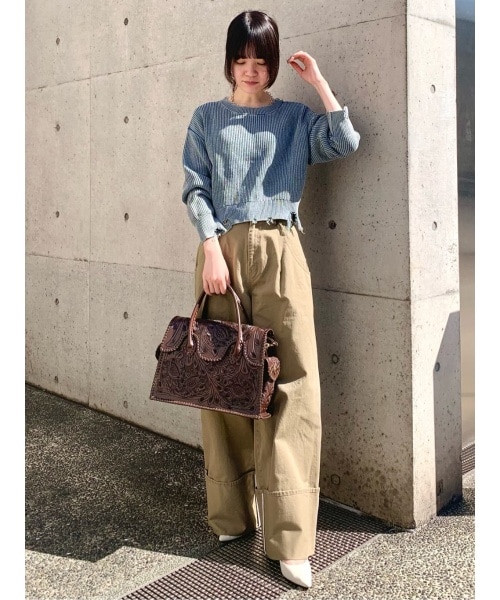 ヴィンテージ風の色抜け具合とカットアウトのデザインが可愛いニット。ジャスト丈で、バランス良くコーデを組むことができ、シャツなどをレイヤードして着ても可愛いです!