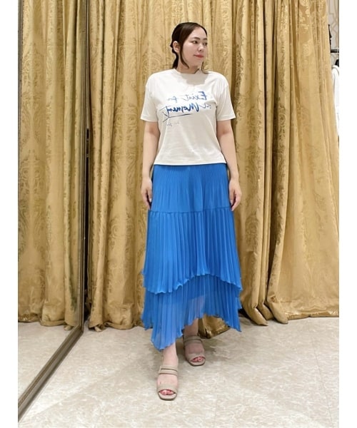 プリントのカラーと同じブルーのスカートを合わせて爽やかコーデにしてみました。デニムに合わせたり上からジャケットを羽織ってもロゴがチラ見えして可愛く着回せそうです!