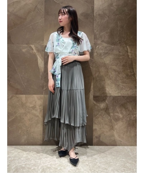 ヨシダエリさんのテキストアートと、“花が咲くひとときの美しさ”をイメージして描かれたフラワーモチーフ柄が目を惹きます。ノースリーブワンピースとカシュクールブラウスをレイヤードしたセパレート仕様になっており、ブラウス部分をスカートと合わせました!