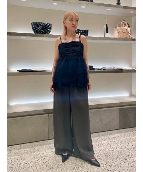 甘めなチュール素材のキャミソールをスラックスパンツと合わせてカジュアルに。足元はポイントテッドトゥのヒールを合わせるとレディ感が出るのでオススメです。