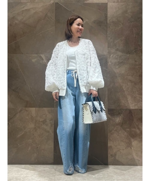トレンドのメッシュ素材にチュールをテープ状にカットし刺繍にしたオリジナル生地。 ボリューム感のあるシルエットに胸元はV開きでスッキリ。フェミニンに羽織れるブルゾンです。