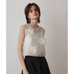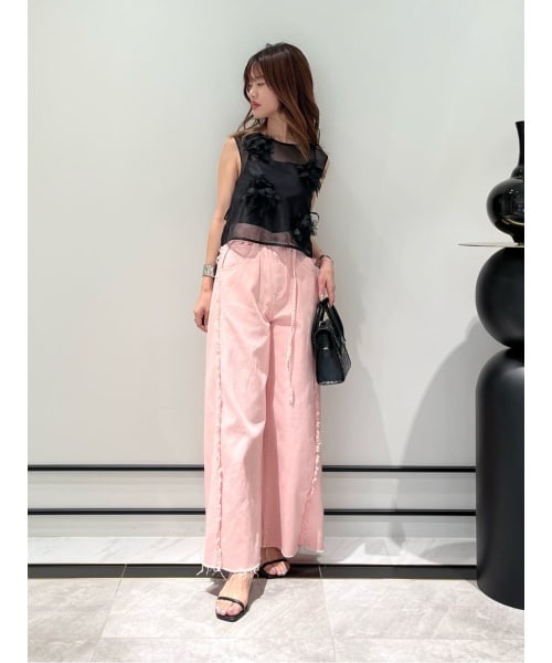 程よく芯のあるチュール素材で作ったコサージュを前見頃に散りばめた、華やかなデザイントップス。両サイドの紐はお好みで調整可能で、付属インナーと一緒に着るとトップスとして、お手持ちのワンピースの上から重ねてスタイリングのポイントにするような着方も可愛いです。