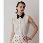 襟が取り外し可能です。メッシュ素材でインナーは付いていませんが、透けにくいお素材です。黒のパンツなどですっきりも着用していただけます。