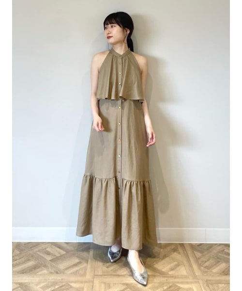 夏のお出掛けに着たいリネンライクなサマードレス。ナチュラルで夏らしい素材が夏にぴったり。シワになりにくく扱いやすいトリアセテート×ポリエステル素材なのも◎ホルターネックは肩を出すことにより、華奢見えするのでおすすめです。