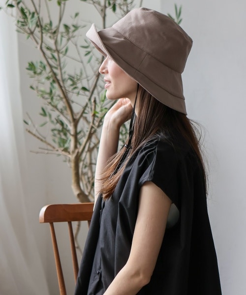 【キャペリンハット】深めの設計と大きめのツバで、顔周りをしっかりと包み込んでくれるので紫外線からお肌を守ります。