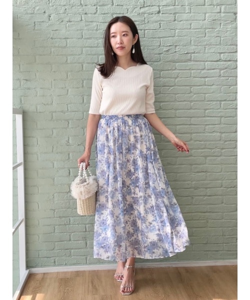 淡ブルーのフラワースカートが軽やかに揺れ、涼しげなフェミニンムードを演出!透明感のある色使いが夏にぴったり◎
