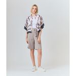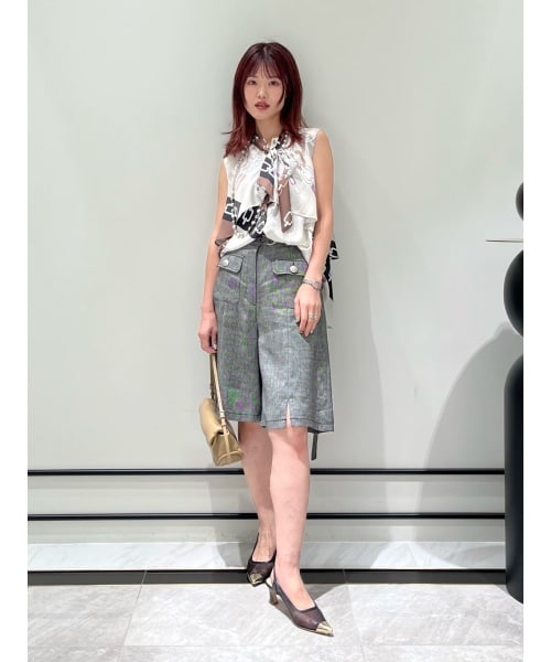 発色の美しいイタリアのインポート・プリント生地でお作りしたボウタイ付ブラウス。肌触りしなやかな微光沢ポリエステル製ツイル素材で、夏場もさらりとお召しいただけます。パンツにサラッと合わせるだけでもサマになるお品です。