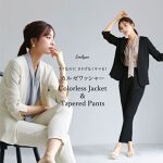 パールキーネックブラウスとカルゼ素材のセットアップスーツを合わせたきちんと感のある上品コーデで洗練された印象に。